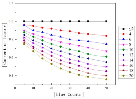 Based on the data of Table 3, the relationship graph between the correction coefficient and the measured hammer number can be plotted. With a specified rod length, this relationship (correction coefficient and the rod length) is shown in Figure 15.