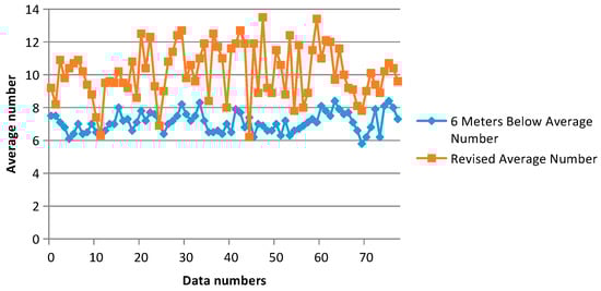It can be seen, from Figure 17, that the average number of strokes before revision was in the range of 6–8. Due to the difference in rod length and hammering number, the corrected average number was in the range of 8–13. The design requirements were as follows: The revised minimum should be no less than three strokes, the average value should be no less than six strokes, and the reinforcement surface (without the cushion layer) below a 6 m range average (beyond ten hits should be eliminated) should be no less than five strokes; it can be observed that the above results met the design requirements.
