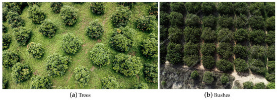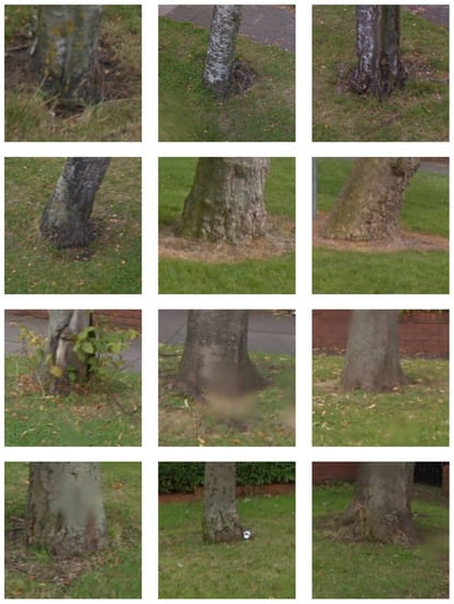 With the abundance of aerial photography freely available from sources like Google Maps and OpenAerialMap, there has been an increasing amount of research into the detection of a variety of entities of interest, such as vehicles [1], buildings [2], and roads [3] amongst others, as well as in the accurate registration of time separated imagery [4], tracking of moving objects [5,6], etc. This research has also been motivated by the increasing use of UAVs in both military and commercial applications [7]. Aerial sensing—be it in the visual spectrum, the so-called colour infrared (CIR) frequencies, or light detection and ranging (LiDAR)—has a clear appeal when it comes to tree detection given the near certainty of the absence of occlusion. Yet, the task is nevertheless a challenging one as a result of two main factors. Firstly, the appearance of trees from above can change dramatically depending on the season and it greatly depends on the specific species. Secondly, other entities such as bushes or patches of grass can be easily mistaken for trees crowns or canopies [8,9] from this angle, as illustrated in Figure 2.