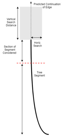 In particular, we start by detecting Gabor edges [20]. Then we are able to identify those edges that correspond to tree edges by finding pairs of edges that enclose high tree likelihood regions under our colour model. This process bootstraps a more complex post-processing algorithm that now uses what are effectively tree stump segments to connect them, thus forming a longer and more reliable continuous tree stump, which can then exhibit greater flexibility in shape. Specifically, by taking into account both colour based likelihood and the geometric directionality of segments, as well as stump width consistency, disjoint segments can be inferred to belong to the same tree and thus connected with each other—a process that is repeated until no further joining is possible; see Figure 4 for a conceptual illustration and Figure 5 for a visual example.