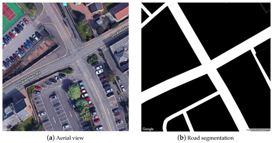 An example of (a) Google Maps aerial view of a suburban land area, and (b) the corresponding road segmentation.