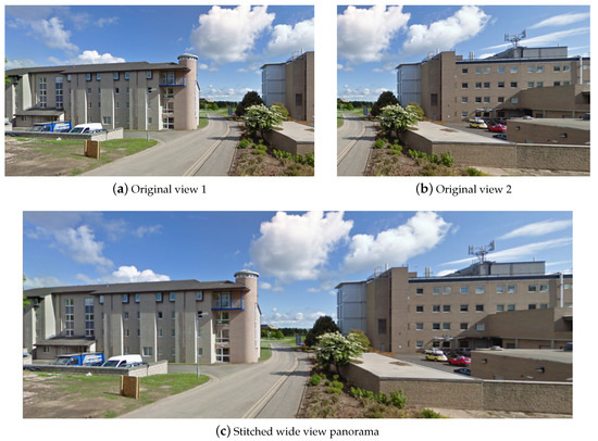 An example of (a,b) a pair original Street View images, and (c) the panoramic image resulting from stitching them together.