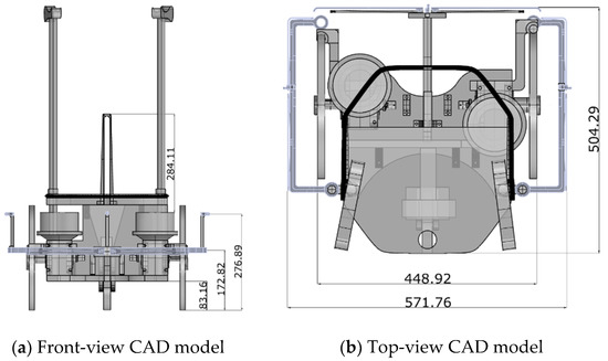 In the development of the device, a structure based on a walker, where the base is a differential mobile robot with a beaver wheel for support, was considered. The walker-like design was adopted because it offered greater stability to the user in comparison with the cane-like structure. Additionally, the differential robot architecture was adopted because it enabled simpler construction and actuation in comparison with the omnidirectional structure. On the other hand, the omnidirectional structure has the advantage of providing greater manoeuvrability to the device. Another advantage of the adoption of a differential structure, in relation to the omnidirectional one, is that its parallel wheels facilitate the transposition of small obstacles, such as gaps between sidewalks. The computer-aided design (CAD) model with the dimensions, in millimetres, of the prototype is illustrated in Figure 1.