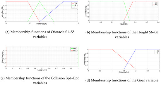 - Collision: Linguistic variables that represent the collision of the device with some obstacle. These variables have two singleton membership functions, ON and OFF, due to the nature of the sensors that represent them, as shown in Figure 14c. These variables are associated with the contact switches CH1–CH6 (see Figure 3); however, they are separated into three groups, i.e., CH1 and CH2 represent collision variable Bp1, CH3 and CH4 the collision variable Bp2, and CH5 and CH6 the collision variable Bp3.