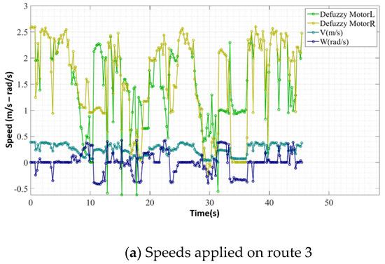 At the beginning of this route, the device approached the obstacle to remain aligned with the objective, until the rules relating to the distance to the obstacle being Very Near at sensors S3 and S4—instant t = 8 s of Figure 23c—were activated. As the values of these sensors began to enter the region of the “Very Near” fuzzy set, the device deviates from the obstacle—t > 8 s and t < 14 s in Figure 23a. This behaviour was expected because the device was already aligned with the objective, so the FIS trend was to slow down until it reached the bypass setting.