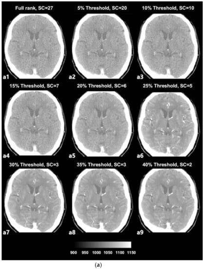 In the used dataset, the full-rank image (original image, a1) included 27 SCs (Figure 3a), i.e., the 1st to the 27th components, which were in decreasing order of magnitude and were not yet classified. In the case of Figure 3a from a2 to a9, with increasing threshold percentages, larger numbers of components were classified as noise components, resulting in denoised images. For example, in the case of (Figure 3a, a2), the 1st to the 20th singular values were included to reconstruct the denoised image labeled as the 5% threshold image, and the 21st to the 27th singular values that were lower than 5% of the 2nd component were separated from the full-rank image and used to reconstruct the separated noise-containing image (Figure 3b, a9). The image a9 that is labeled as 40% of the threshold image was reconstructed including only the 1st and 2nd singular values by separating the largest number of SCs (25 SCs) from the full-rank image. Nonetheless, the image still appears to exhibit sufficiently high image quality. Regarding image a9, the 1st and 2nd singular values are predominantly depicted as providing diagnostic information. However, it is difficult to confirm that the image at the 40% threshold is the best one, as it simply involves the separation of a larger number of noise-related patterns; reducing the noise on a medical image is inevitably a trade-off for acquiring diagnostic information.
