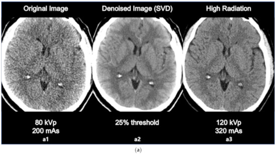 The results of the SNR and CNR estimations are presented in Figure 5a,b. In Figure 5a, the mean SNRs at the basal ganglia level exhibited a significant increasing tendency except for the 15% and 30% threshold values. The largest improvement involving a significant 16% increase (t = 2.908, p < 0.005) was observed at the 40% threshold setting. Similarly, in Figure 5b, the mean CNRs at the basal ganglia level maintained an increasing tendency for every threshold setting. The largest improvement involving a significant 43% increase (t = 6.327, p < 0.001) was also observed at the 40% threshold setting. However, image a6 that is labeled as 25% of the threshold value resulted in the best statistical significance per the results of the paired t test (t = 3.764, p < 0.001), resulting in an adequate 14% increase in the SNR. Considering the example dataset presented in Figure 3a, even though the 40% setting resulted in the highest SNR, the 25% setting appeared to generate more diagnostic information associated with the vessels. The 25% setting also resulted in good CNR estimation results with a statistically significant 37% increase (t = 6.080, p < 0.001). Based on these findings, we considered that the 25% setting could potentially be the optimal setting for 4D axial CTP images at the basal ganglia level in terms of compromising between noise reduction and preserving diagnostic information. In addition, we would like to highlight that we were able to achieve a considerable improvement in quantitative image quality in the denoised images without having to increase the radiation dose. Figure 4a,b shows the comparison of the original image with the lower dose image (80 kVp, 200 mAs, a1), the denoised image (80 kVp, 200 mAs, 25% of threshold, a2), and the higher dose image (120 kVp, 320 mAs, a3). Regarding Figure 4a,b, we would like to believe that we were able to improve the diagnostic value of low dose (Figure 4a,b, a2, b2) image similar to the ones scanned with high dose (Figure 4a,b, a3, b3) by using the proposed SVD-denoising technique. In other words, there is potential to preserve sufficient image quality even in scans involving lower tube currents. Lowering the tube current and tube voltage is the simplest way to reduce the radiation dose involved in a CT scan. Based on the fact that the amount of noise on an image is inversely proportional to the square root of the radiation dose, reducing tube current and tube voltage can inevitably lead to the degradation of image quality, thereby generating a larger amount of noise on the image [30,31]. Considering this, additional studies to investigate the qualitative and quantitative comparison between the denoised lower dose image and higher dose image on CTP may be meaningful. Additionally, further study with artificial biological objects using 3D bioprinting will be required for more accurate evaluation.