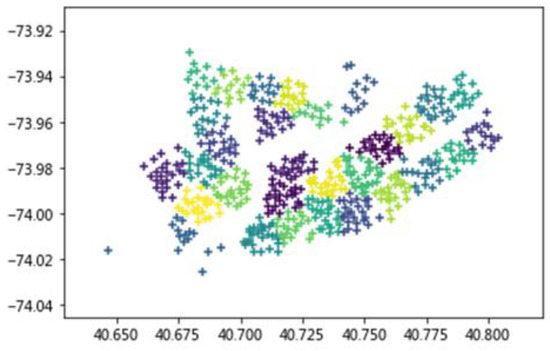 Each station in the New York City public bicycle trip data published on the Public Bicycle System website corresponds to a unique ID number. As the station name is relatively long, this section will use the corresponding ID number to indicate the station. Figure 1 shows the stations in the geographic coordinates. Different colors represent different blocks. There are 30 blocks in total. Among them, the abscissa is the latitude of the bicycle station and the ordinate is the longitude of the bicycle station.