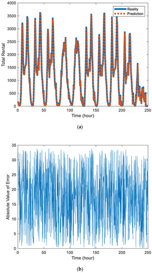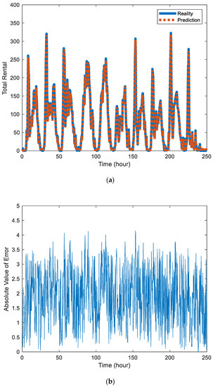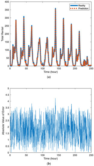 - The third step was to select real data for comparison with predicted data. Based on the experimental data compiled in the first step, the bicycle rental data from September 21 to 30 September 2016were used as test data for this experiment. The model input data processing is the same as in the second step.