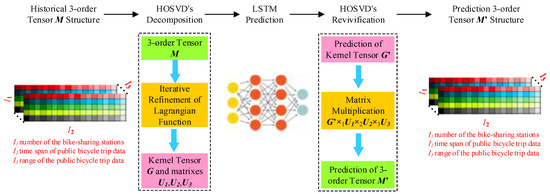 The proposed method in this paper has the same features as in [22]. The proposed method and [22] both take into account the spatiotemporal correlation of the data distribution. The proposed method used the HOSVD to simultaneously predict the public bicycle trip data for all bike-sharing stations in the entire city as a whole. Thus, the proposed method in this paper can consider the spatiotemporal dependencies, which have been neglected by the classic LSTM model.