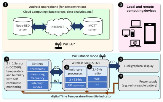 Cloud computing (block ⓕ) plays a major role in the whole IoPT ecosystem for medicine reuse by connecting medicines with all stakeholders. In the current example, two cloud servers were established to support information sharing between stakeholders: a MQ Telemetry Transport (MQTT) server for exchanging short messages between smart sensors such as the dTTHI in the current study, and a Node-RED server for performing information management and other administration functions such as analysing the raw data or displaying infographics. A WiFi router was necessary in the whole platform routing the WiFi signals between the dTTHI and the Internet cloud servers. For demonstration purposes, an Android smartphone (a Google Pixel model running Android OS version 10) was used to simulate a cloud computing platform. Using a terminal application (Termux, https://termux.com), an MQTT broker application (mosquitto version 1.5.7, https://mosquitto.org), and a Node-RED server (node-red v0.20.3, https://nodered.org) were installed on the smartphone. The Android smartphone also acted as a WiFi AP using tethering, thereby, setting up its own network. Finally, the smartphone simulated a cloud computing platform that could be connected directly through a gateway on its own.