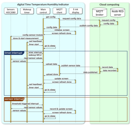 Initialisation of the dTTHI starts from registering the device identity code to the servers, and the current date and time as well as other updated information are pushed to the device (through MQTT publish/subscribe protocol). The current date and time information are important for a dTTHI device when power is reapplied the first time after leaving the pharmaceutical company. The e-ink display is refreshed illustrating the current status of the device (see Figure 5 for details of the screen content). The HDC2080 sensor module is also initialised to configure the automatic measuring frequency (suggested one measurement per minute), the high and low limits for both temperature and humidity readings to trigger a hardware interrupt to the main MCU, and also the mode of operation settings (e.g., taking both temperature and humidity for each measurement, enabling trigger pulse instead of trigger level, etc.). Finally, before the ESP32 module enters sleep mode, the wake-up timer is set to get the main MCU to work once per day. When the main MCU wakes up, it reads the sensor data, calculates the average value for all environmental parameters, updates the e-ink display, and turns on the radio to upload data to the cloud servers through MQTT messages. At the end of the initialisation session, the main MCU enters sleep mode and waits for interrupts from the sensor module or internal timer. The sensor module starts to measure temperature and humidity at a frequency set during initialisation, and its internal comparison logic triggers a hardware interrupt when the readings exceed the thresholds. The main MCU reads the sensor measurements after a hardware interrupt, stores the readings, updates the bar chart (i.e., how long the readings exceeded the thresholds), and refreshes the e-ink display content, but with the upload of data occurring at the wake-up interrupt scheduled by the timer.