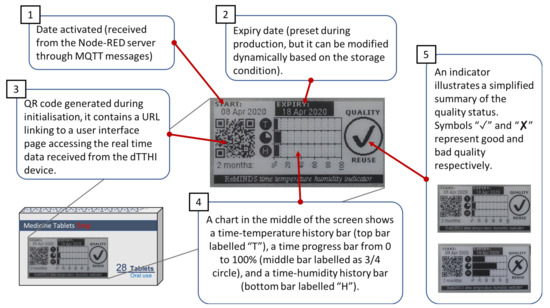The e-ink display enables local connectivity for patients or pharmacists. Five major components on the surface of pharmaceutical packaging, as shown in Figure 5 illustrate the real-time quality status of the packaged medicine: shows the activation date (i.e., the date the medicine is dispensed at the pharmacy) of the dTTHI and is extracted from the Node-RED server during initialisation. is the expiry date of the packaged medicine preset at the pharmaceutical company during production, however, it can be altered when necessary through the cloud servers (e.g., shorten the expiry date when the storage condition doesn’t meet the standard). is a Quick Response (QR) code generated by the program during initialisation and it contains a link to access the user interface of the Node-RED server. A smartphone or any computing devices with a camera can scan the QR code and launch the web page automatically. This is a convenient way for the patients or other stakeholders to view the detailed information and sensing results of the dTTHI from the cloud servers. shows a summary chart of the accumulated time-temperature and time-humidity history that the packaged medicine has experienced. The top bar in the chart labelled “T” is the accumulated time-temperature history, and the bottom bar labelled “H” represents the accumulated time-humidity history. The bar in the middle with a three-quarter circle label is the time bar which is a progress bar extending from 0% at the start and progresses to 100% at the end of the expiry date. Exceeding the temperature and/or humidity thresholds trigger the accumulation for the “T” and the “H” bars respectively. is a simplified quality checker which shows a tick symbol if the quality of the packaged medicine is still in good condition for normal usage as well as for returning to the pharmacy for re-dispensing. On the other hand, if a cross symbol is displayed this depicts possible bad quality and the need for a decision on whether the medicine can be re-used to be taken by the pharmacists based on seeing the detail of the sensing data retrieved from the cloud servers.