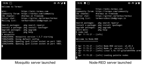 For demonstration purposes, an Android smartphone was used to simulate a cloud computing environment. By using a simulated cloud computing platform this avoided the complicated free account setup process to commercial cloud services. This also provided a self-contained networking platform using an Android smartphone which enabled easy demonstration without an Internet connection. The smartphone was setup as a hotspot (or WiFi tethering), thus, it setup its own WiFi network. Three third party programs needed to be installed to setup the simulated cloud computing platform: Termux (https://termux.com), Mosquitto (https://mosquitto.org), and Node-RED (https://nodered.org/docs/getting-started/android). The Termux app was installed first in order to use the command line interface to install the other two programs, and Figure 6 illustrates the terminal screens for launching the two cloud server programs on an Android smartphone. For real life applications, these two servers as well as other cloud servers with different purposes would be hosted by internet service providers anywhere on the globe wherever an Internet connection is available.