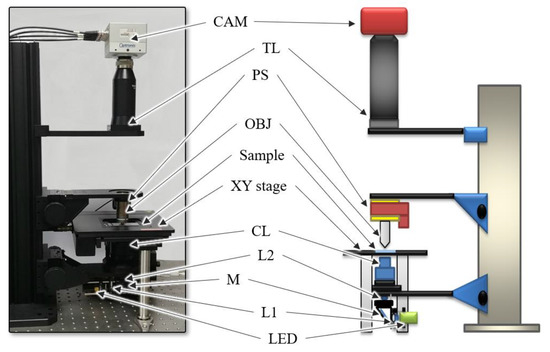 Schematics of the experimental setup. Light-emitting diode (LED): light source, L: lens, M: mirror, CL: condenser lens, OBJ: objective lens, PS: piezo stage, TL: tube lens and CAM: camera.