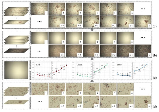 Figure 2. shows the flow of the proposed method that estimates the flat-field distortion and corrects the shading distortion. The proposed method comprises primarily of two main steps. The first step constructs candidates for flat-field distortion (Figure 2b) from a stack of input sequences (Figure 2a). Using the brightfield WSI device allows the background pixels, which does not contain objects such as cells to block the illumination light, to have higher values than the object pixels. Based on this assumption, the proposed method constructs candidates by separately sorting the intensity values of red, blue and green channels at each pixel axis and then merging those three channels into a single RGB image. Figure 2b shows the candidates constructed from the image sequences in Figure 2a. The highest intensity values of three channels (the brightest pixel values) at each pixel axis are placed at the first candidate, whereas the darkest pixel values are placed at the last (nth) candidate.