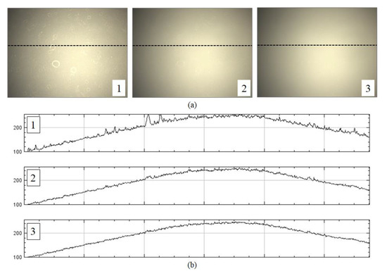 In the second step of the proposed method, the optimal flat-field distortion among the candidates is selected. The candidate constructed with the highest values at each pixel axis can be considered as the optimal flat-field distortion. However, if typical artifacts, such as specks of dust, scratches and bubbles appear on the microscopic slide, they are reflected in the candidates constructed with higher values, as shown in Figure 3. Figure 3a shows more detailed (enlarged) images for 1, 2 and 3 of Figure 2b, while Figure 3b shows the intensity profile for a red channel on a dotted line segment. Therefore, estimating an optimal flat-field distortion robust to typical image artifacts can be considered as a problem of selecting a candidate with minimum artifacts. After estimating the flat-field distortion , input image sequences are corrected using Equation (2). Figure 2d shows result image sequences that the input image sequences (Figure 2a) are corrected by the estimated flat-field distortion (Figure 2c).