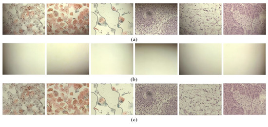 Digital slide images are typically generated by stitching image sequences acquired from different FOVs of a sample into a single whole-slide image. However, shading distortion, caused by uneven illumination [10], can produce black plaid patterns when stitching image sequences acquired to cover the whole slide, which degrades the visual quality of the digital images [11,12,13]. Moreover, the black plaid patterns on the images adversely affect subsequent image analysis, such as segmentation and quantification [14].