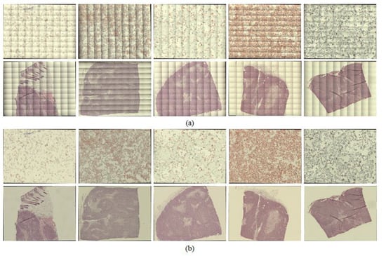 Examples of whole-slide images, with shading corrected by the proposed method: (a) whole-slide images before applying shading correction and (b) whole-slide images after applying shading correction.