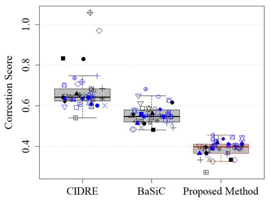 where denotes the ground-truth image. The ground-truth images in the experiments were obtained based on the empty-zero method [17], which estimated the shading distortion as the average of images of an empty slide obtained at various locations. The correction score is in the interval , where 0 indicates perfect correction, 1 indicates the same amount of error as the uncorrected image and >1 indicates a greater disagreement. Figure 6 shows the correction scores of the proposed method and the two previous methods, CIDRE and BaSiC. The correction scores, averaged over 40 image collections, are as follows: the proposed method, 0.39 ± 0.099; the CIDRE method, 0.67 ± 0.047; the BaSiC method, 0.55 ± 0.038. Each symbol in Figure 6 indicates one of 40 image collections and each image collection consists of 100 images.