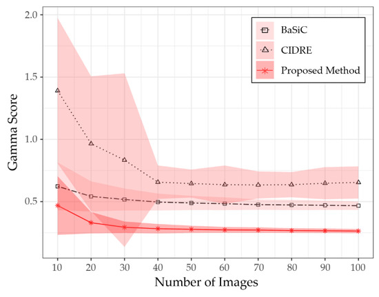 To verify the minimum number of images to obtain the correction score given in Figure 6, we evaluated the performance of the proposed method as a function of the number of images. Figure 7 shows a graph representing correction scores according to the number of images used to model the shading distortion. The x-axis of the graph represents the number of images, randomly selected from each collection. The y-axis represents the correction scores, averaged over five different sets of images randomly selected from each component. In Figure 7, each curve is the average score of the five different sets of images, while the shaded area represents the standard deviation. As shown in Figure 7, the proposed method obtained the correction score given in Figure 6 if more than 30 images are given to model the shading distortion.