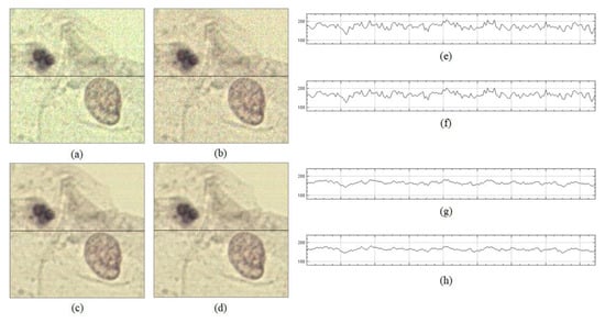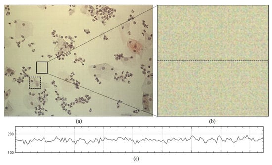 The proposed method outperformed the two previous state-of-the-art methods because it could estimate the flat-field distortion that was robust to the fixed-pattern noise. The statistical test was performed for comparison between the means using the Wilcoxon signed-rank test, used in BaSiC [15]. It showed a significant difference between the proposed method and the two methods (n = 100, p-value = 1.819 × 10−12). Figure 8 shows an example of the fixed-pattern noise, which is a spatial variation in pixel values under uniform illumination, where Figure 8b shows an image in which a specific area of the input image is enlarged, whereas Figure 8c c shows the intensity profile for the red channel on the dotted line segment of Figure 8b. Figure 9 shows the resulting images that were shading-corrected by the two previous methods and the proposed method for the dotted box in Figure 8a. As shown in Figure 9, the results of the shading correction by the two previous methods still exhibited fixed-pattern noise, whereas it was reduced by the proposed method.