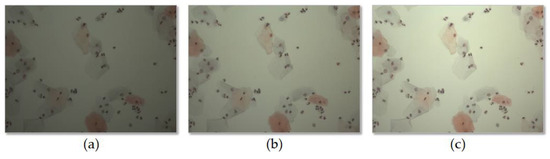 Example of image acquired at each brightness level. (a) 100, (b) 150, and (c) 200.