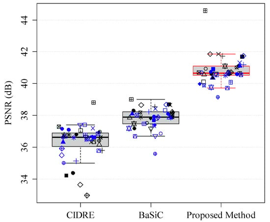 Because the images that were shading corrected by the previous methods (Figure 9a,b) resembled those corrupted by noise, we additionally evaluated the quality of the shading-corrected images using a peak signal-to-ratio (PSNR). Figure 2 shows the PSNRs of the proposed and two previous methods. The higher the PSNR, the better is the quality of the shading-corrected image. The PSNRs, averaged over 40 image collections, are as follows: the proposed method, 40.80 ± 0.85 dB; the CIDRE method, 36.32 ± 1.09 dB; the BaSiC method, 37.83 ± 0.66 dB, respectively. Based on the quantitative evaluations with the correction scores and PSNR, we can confirm that the proposed method can correct not only shading distortion, but also fixed-pattern noise, compared with the two previous methods, as shown in Figure 6 and Figure 12.