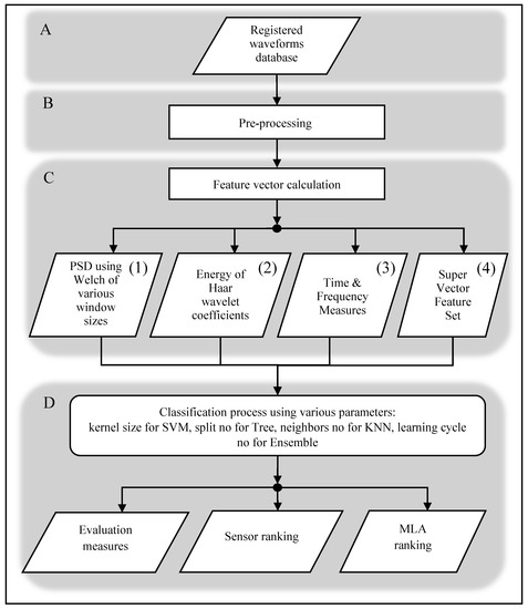 Furthermore, the Hilbert transform was applied to the absolute value of the registered signal amplitude, and the envelope was determined by this means. The envelope was subjected to Time Feature set determination, in which the following measures are included: shape and peak coefficients, maximum value, arithmetic, geometric and harmonic mean, median, kurtosis, slope, standard deviation, and variance. The Time and Frequency Measures were combined as subsequent (3) features set. Additionally, all the measures were combined into one (4) Super Vector features set and applied for classification. Similar methods of feature extraction are performed by other groups of scientists. For example, Time features and Frequency features were determined according to reference [47,48] and [15]. In [15], the authors classify AE signals processed with the use of wavelet transformations and using random forest and KNN algorithms to locate corrosion in devices applied in the chemical industry. After the features are determined, they are applied for the (D) classification process, which results in a ranking of the sensors and MLA. This step is described in detail further in this section.