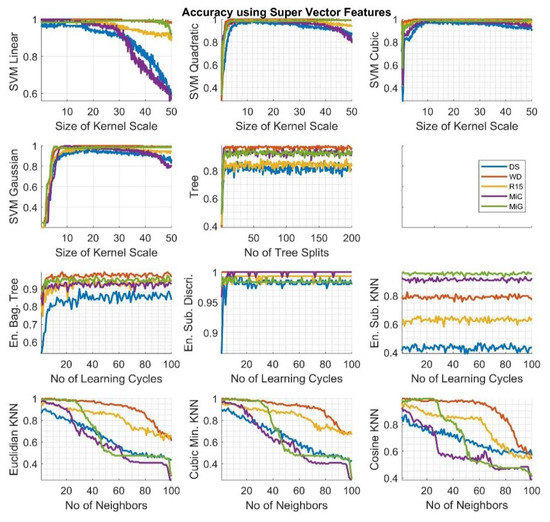 In Figure 4, the calculation results, which depict the validation accuracy values gathered for particular algorithms using the Super Vector features set for the classification process are presented. The colors of particular lines correspond to data related to signals registered by the individual sensors.