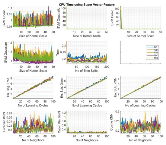 Calculation results—the CPU time for particular algorithms using the Super Vector feature set. The legend for the colors corresponding to the individual sensors can be found on the right side of the image.