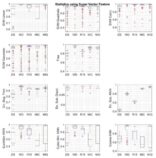 In Table 2, summarized results gathered from comparative analysis obtained for all four considered feature sets using six various measures of classification quality are depicted. The presented data include the best and the worst cases: the maximal and minimal calculated values of the measure, the algorithm for which it was determined, and the sensor, with which the AE signals were registered. As has already been stated several times in this paper, based on analyses of validation accuracy, here, in an overall comparison of the results obtained, it was confirmed that the highest values were obtained for the Super Vector feature set, ESD algorithm, and the WD sensor.