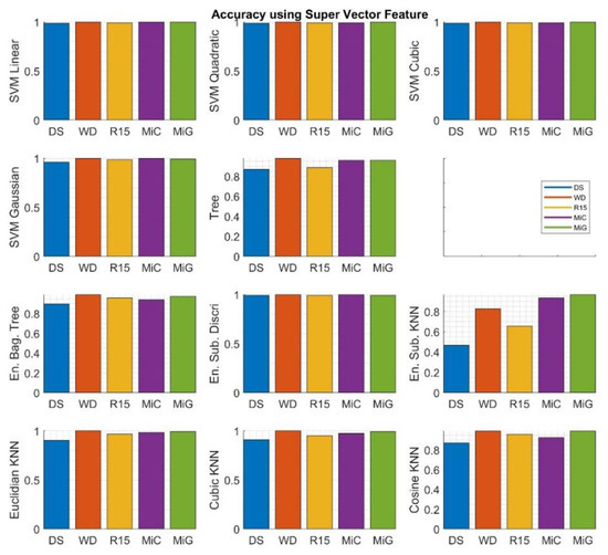 Calculation results—the validation accuracy value for particular algorithms using the Super Vector feature set. The legend for the colors corresponding to the individual sensors can be found on the right side of the image.