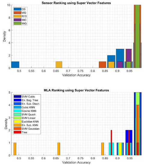 Results of analysis depicting quantities of the best sensor (upper) and the best machine learning algorithm (MLA) (bottom) applied for classification using the Super Vector feature determined using validation accuracy value.