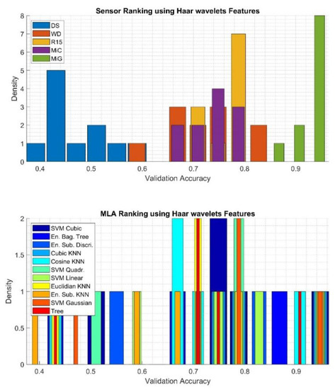 Results of analysis depicting quantities of the best sensor (upper) and the best MLA (bottom) applied for classification using the Haar wavelets features determined using validation accuracy value.