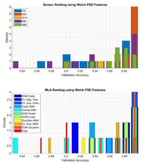 Based on data presented in Figure 10 top, which is related to results gathered using the Haar wavelets feature set, it can be seen that by far the best results are achieved for signals registered with the MiG sensor. Moderate validation accuracy values, in the range 0.6-0.8, were gathered for signals registered by WD, R15, and MiC, while the worst were gathered for signals registered by the DS sensor. In terms of determining the optimal algorithm, the evaluation is not trivial because all algorithms obtain flat density distributions. In most cases, the worst results were obtained for the ESK algorithm.