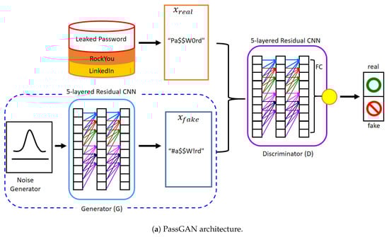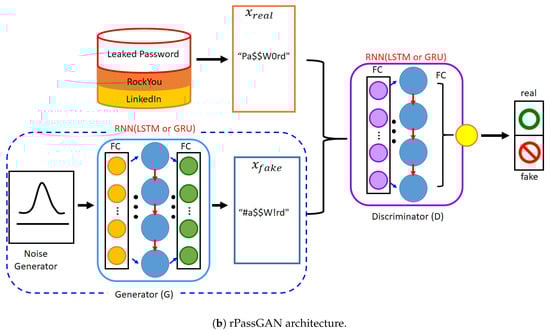 The model architecture of PassGAN & rPassGAN: PassGAN’s G and D consist of a five-layered residual convolutional neural network (CNN) with filter size 5. Otherwise, we replace the five-layered residual CNN with a one-layer RNN. In the rPassGAN, the red arrow stands for the recurrent flow. We mainly use gated recurrent unit (GRU) cells, because the training and sampling speed is better than long short-term memory (LSTM). FC stands for the fully-connected multilayer perceptron (MLP) in both Figure 1a,b. GAN stands for generative adversarial network.