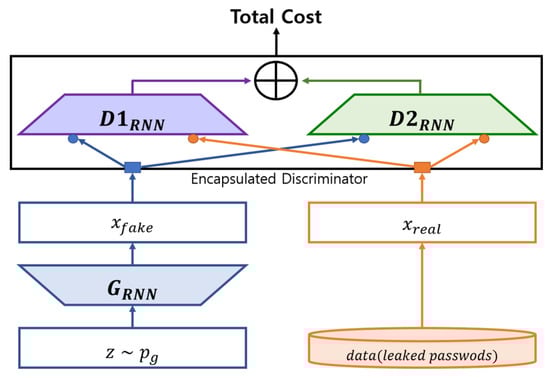 We also proposed a change to the model of D and G from CNN to RNN, while simultaneously changing the structure of the GAN. When changing the GAN structure, we proposed the application of dual discriminators that utilize the IWGAN’s cost function. D1’s role is to identify the authentic passwords among the samples, whereas D2’s role is to identify the pseudo passwords among the samples. Both discriminators would execute the same role as in Nguyen and colleagues’ D2GAN method []. The objective of G in this dual-discriminator GAN model would be the deception of both discriminators, where the distribution of both the authentic and pseudo password samples created by G has to be indistinguishable. This creates a situation in which D1 and D2 are not able to differentiate between the authentic and pseudo passwords. Each discriminator’s cost is defined, in this first dual-discriminator model, with both discriminators being trained to minimize the cost. In contrast, the generator is trained to augment the total costs (Algorithm 1). This dual-discriminator combination PassGAN is known by its abbreviation rPassD2CGAN (Figure 2).