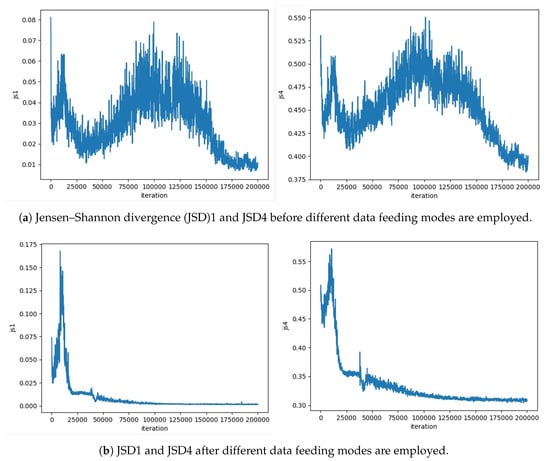rPassD2CGAN exhibited some unstable training results. The data used in the default training data feeding mode are identical in all discriminators. We provided D1 and D2 with the same fake and real passwords; however, when class 4 (number, special characters, alphabet lower and upper) long password data were provided, the rPassD2CGAN training status was unstable. Usually, the Jensen–Shannon divergence (JSD) reduces and then reaches an almost constant value. In the case of rPassD2CGAN, the JSD value did not converge but exhibited instability, as shown in Figure 3a. To solve this problem, we changed some hyper-parameters such as the batch size, G/D ratio, layer dimension, and learning-rate, but these measures were not effective. After many attempts, we decided to change the training data feeding modes. We tested two cases: one used the same real training data and different pseudo data for two discriminators, and the second used different real and pseudo training data feeding modes for two discriminators. These two training data feeding modes in Figure 4 enable rPassD2CGAN to carry out stable training. The password cracking results were similar but were not exactly the same.