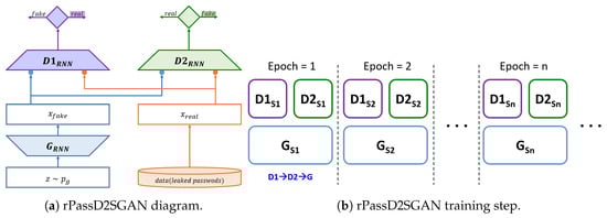 Here, we introduce another dual-discriminator model that is slightly different from rPassD2CGAN. In rPassD2CGAN, two discriminators D1 and D2, were encapsulated; thus, the two discriminators operated as one discriminator, from the perspective of loss. In the second dual-discriminator model, D1 and D2 are not combined, and the hyper-parameters of D1 and D2 are trained sequentially. Algorithm 2 describes this operation. We use the same training parameter values of rPassD2CGAN for this model. We call this model rPassD2SGAN, and its block diagram is shown in Figure 5. The training sequence is D1, D2, and G, as shown in Figure 5b. rPassD2CGAN and rPassD2SGAN performed similarly in terms of their password cracking performance.