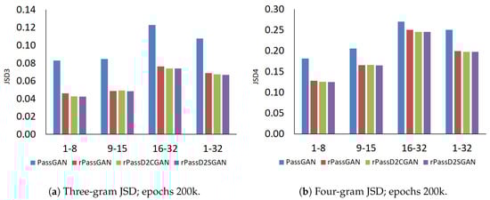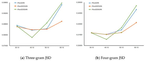 The lower the JSD value, the closer the value to the password distribution generated by people. In Figure 6, RNN-based models had the lowest JSD at 40:10 as G/D training iteration parameter. When we compared the cracking performances of rPassGAN, rPassD2CGAN, and rPassD2SGAN, we used the same hyper-parameters, such as the learning rate, G/D iteration ratio, and Adam optimizer parameters, to reduce other factors which may affect the performance.