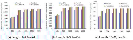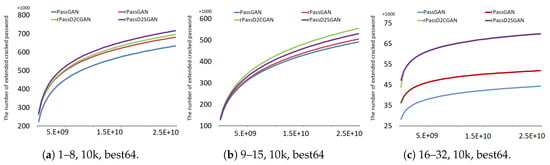The connection between the number of password predictions and the number of increased password cracks is displayed in Figure 9. A deviation appears between the early training (10k epoch) model and the final (200k epoch) model when the number of increased password cracks is analyzed. At the beginning and even until the latter half of the experiment, both rPassD2CGAN and rPassD2SGAN display the highest number of increased crackings for the early training (10k epoch) model. When analyzing the 200k epochs, the only difference that can be confirmed is between PassGAN and the three RNN models due to the slim difference between the RNN models. A negligible difference can be seen in the results for the password-length groups. However, rPassD2CGAN and rPassD2SGAN performed better than rPassGAN in the case of the password length groups 9–15 and 16–32.