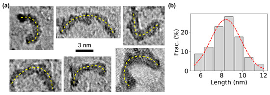 TEM visualization of bent DNA bows. (a) Examples of TEM images of DNA bows. The bending of the DNA bows is highlighted by the yellow dashed lines. Scale bar = 3 nm. (b) Distribution of the arc lengths of DNA bows, which was fitted by a Gaussian distribution (red dashed line), resulting in an average length of 8.4 ± 1.4 nm (mean ± standard deviation).