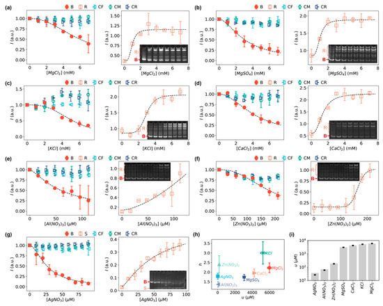 Intensities of the bands of DNA bows (red circles), relaxed DNA loops (orange squares), and linear DNA controls (cyan triangles, green pentagons, blue triangles) in the presence of various salts at increasing concentrations: (a) MgCl2, (b) MgSO4, (c) KCl, (d) CaCl2, (e) Al(NO3)3, (f) Zn(NO3)2 and (g) AgNO3 (the orange squares for AgNO3 are for the dissociated single strands S). Insets are the representative, cropped gels of bent DNA bows in the presence of the corresponding salts at increasing concentrations. B and R (or S) indicate the bands used for quantification of the intensities. The corresponding full-length gels are shown in Figure S1. Error bars in panels a–g represent the standard deviation from 2–4 replicates. (h) Fitted and values from the modified Hill equation for the inorganic salts. (i) Fitted -values for quantifying the strength of DNA interactions with inorganic salts.