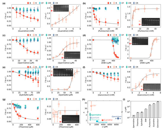 Intensities of the bands of DNA bows (red circles), relaxed DNA loops (orange squares), and linear DNA controls (cyan triangles, green pentagons, blue triangles) in the presence of small organic molecules at increasing concentrations: (a) guanidine, (b) putrescine, (c) spermidine, (d) ethidium bromide, (e) SYBR safe, (f) ganciclovir, and (g) thiamine. Insets are the representative, cropped gels of bent DNA bows in the presence of the corresponding small organic molecules at increasing concentrations. The corresponding full-length gels are shown in Figure S2. Error bars in panels a–g represent the standard deviation from 2–4 replicates. (h) Fitted and values from the modified Hill equation for the organic molecules. (i) Fitted -values for quantifying the strength of DNA interactions with organic molecules.