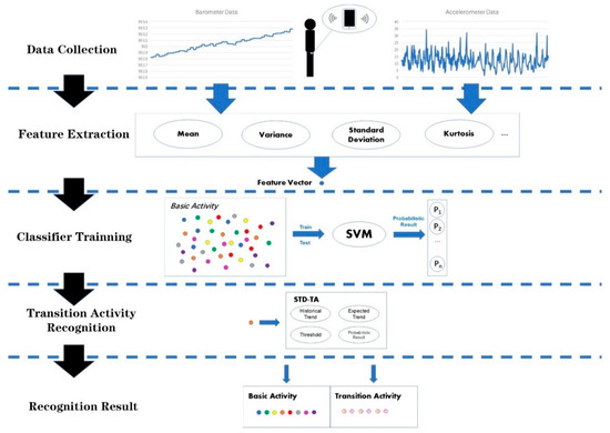 First, based on the results of our previous work [27], we put a smart phone on the right leg of subjects to collect data in order to achieve the best classification results. The data includes accelerometer data and barometer data. We separate the set into two types: basic activity and transition activity. Then we segment data via a sliding window algorithm and divide all the segments into two parts, one for training and the other for testing. In the feature extraction stage, we extract the statistical features of data segments to reduce the dimension of data and facilitate the training of classifiers. Considering the excellent performance of SVM in pattern recognition [28,29], we train a SVM model as the core classifier in the classifier training stage. SVM outputs the recognition results in the form of probability, which is namely the probabilistic results. In the transition activity recognition stage, we take advantage of the standard deviation trend analysis (STD-TA) method to judge whether the current activity is a transition activity. The final results are achieved in the recognition result stage, and transition activity is distinguished from basic activity.