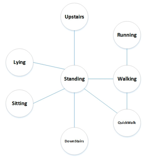 Figure 4 mainly specifies the basic activities between which the transition activities will take place, so that some illogical transitions could be effectively avoided to promote the overall accuracy. In the figure, there is no transition between basic activities without connection, such as “Lying” and “Running”. The rules can effectively avoid some recognition errors. According to the diagram, there are 14 transition activities in total. Here, we clarify some definitions: