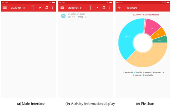 We design this APP to realize the activity recognition and statistics of subjects. We collect activity data using the built-in accelerometer and barometer of a smartphone and recognize the daily activity via the model described in the former sections. Due to the fact that the APP is just in a test stage, the recognition results are stored locally. Meanwhile, we design a long-term monitoring module for users in the APP. The line chart in Figure 5 gives the users’ activities in the previous 7 days, while the pie chart shows the duration and proportion of each daily activity of the users. These functions provide vital context information for high-level applications.
