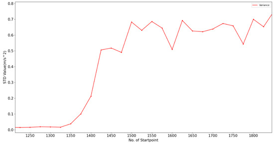 According to the figure, the vertical axis represents the STD value of the window, and the horizontal axis denotes the starting data point of the window. For example, there is a data point (x = 1150, y = 0.0159) in the figure, which represents the data of a window composed of 50 data points 1150–1200. The STD value of these data is 0.0159.