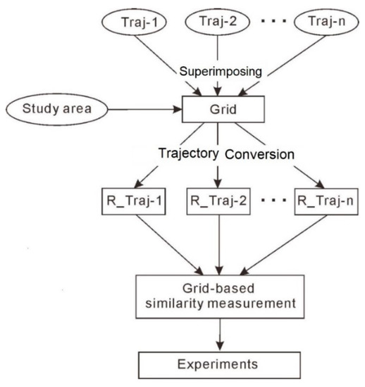 A trajectory is a sequence of time-stamped sampling points, and its location information can be represented as a list of geographic coordinates. In order to emphasize the impact of locations while eliminating the disturbance of geometric details of trajectories in the process of similarity measurement, the trajectory was represented with grid-codes in our algorithm. The algorithm runs through two main phases, followed by an algorithmic verification phase (Figure 2). Phase I consists of grid-based trajectory conversion. First, a rule for determining the appropriate grid size is defined in order to convert the study area into grids (Section 2.1). Second, the original trajectory data (i.e., Traj-1, Traj-2, …, Traj-n) is superimposed on a coded grid to achieve trajectory conversion (Section 2.2). After the trajectory conversion, the original trajectory data is represented by grid-codes and converted into R_Traj-1, R_Traj-2, …, R_Traj-n. In Phase II, through algorithm design, different types of trajectory similarity measurements are realized in Section 2.3. The following sections explain the workflow in detail.